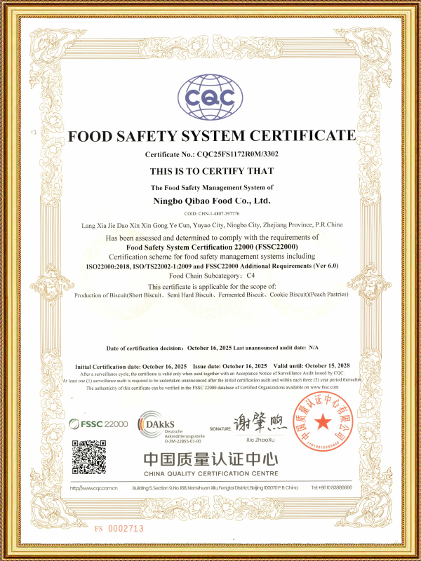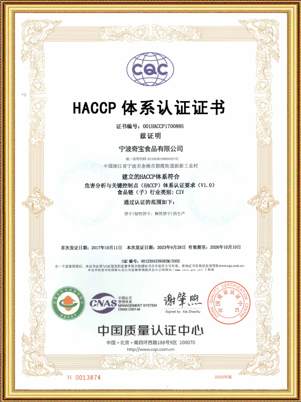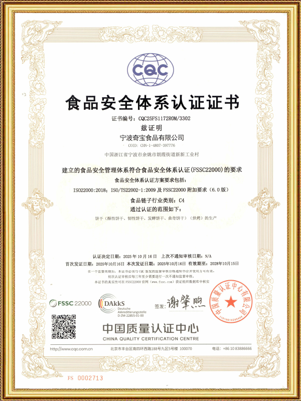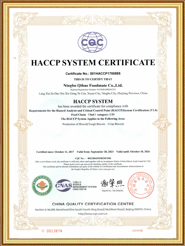 La empresa se compromete a proporcionar productos de alta calidad y posee múltiples certificaciones autorizadas, incluida la certificación FSC22000 y la certificación del sistema HACCP. Estas cualificaciones han sentado una base sólida para que la empresa se expanda a los mercados internacionales y participe en la competencia internacional.